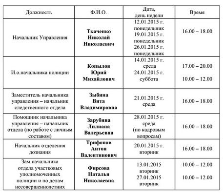Прием граждан руководящим составом проводится в здании Общественной приемной граждан УМВД России по г. Керчи по адресу: 298300, г.Керчь, ул. Ленина, 8.
