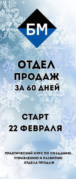 http://molodost.bz/otdel_prodazh/?partner_code=ID39 - «Отдел продаж за 60дней». Старт 22 февраля. Практический курс по созданию, управлению и развитию отдела продаж. Занятия в основном проходят по субботам на протяжении 2-ух месяцев с 12.00 – 20.00 (с перерывом на обед).