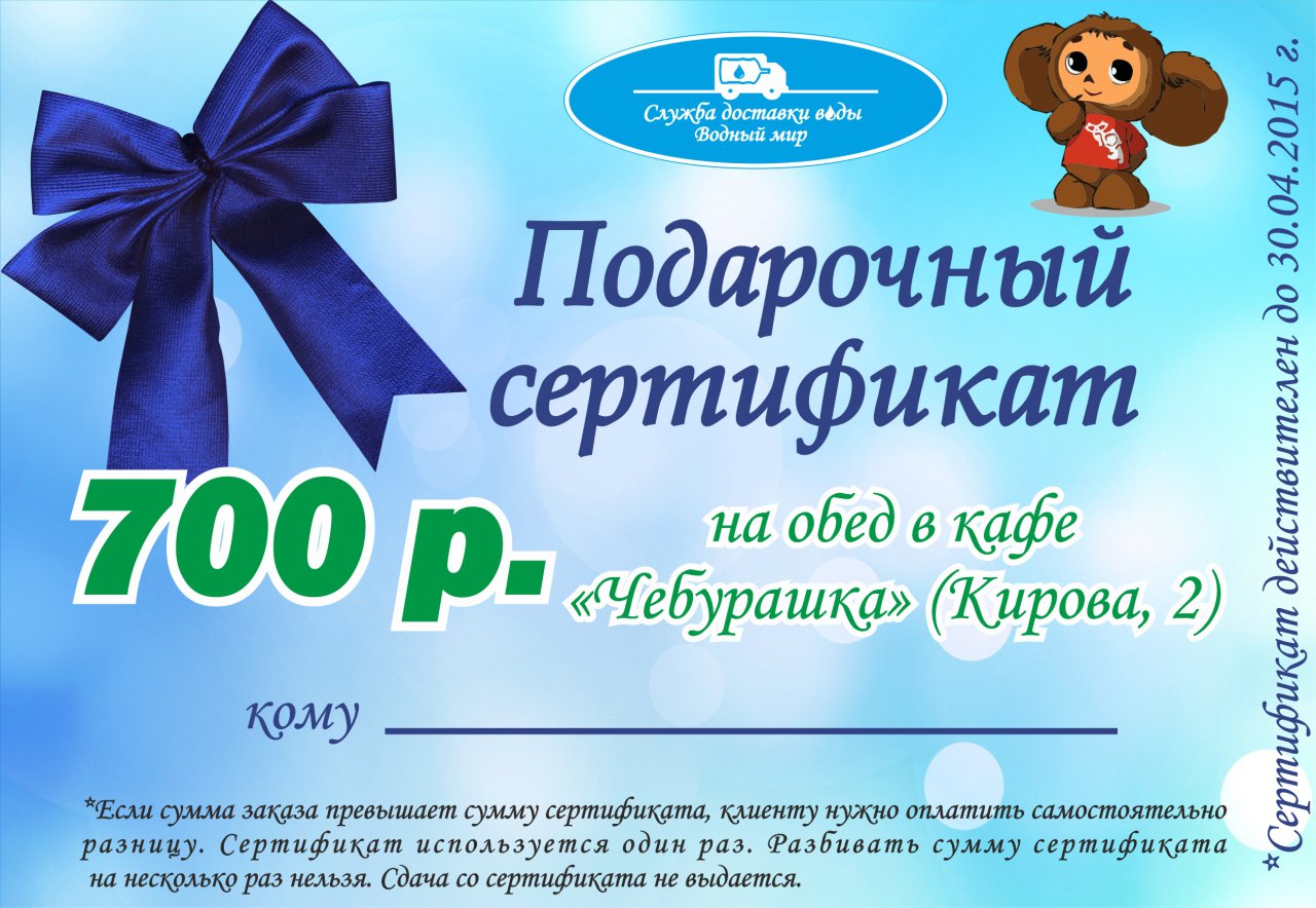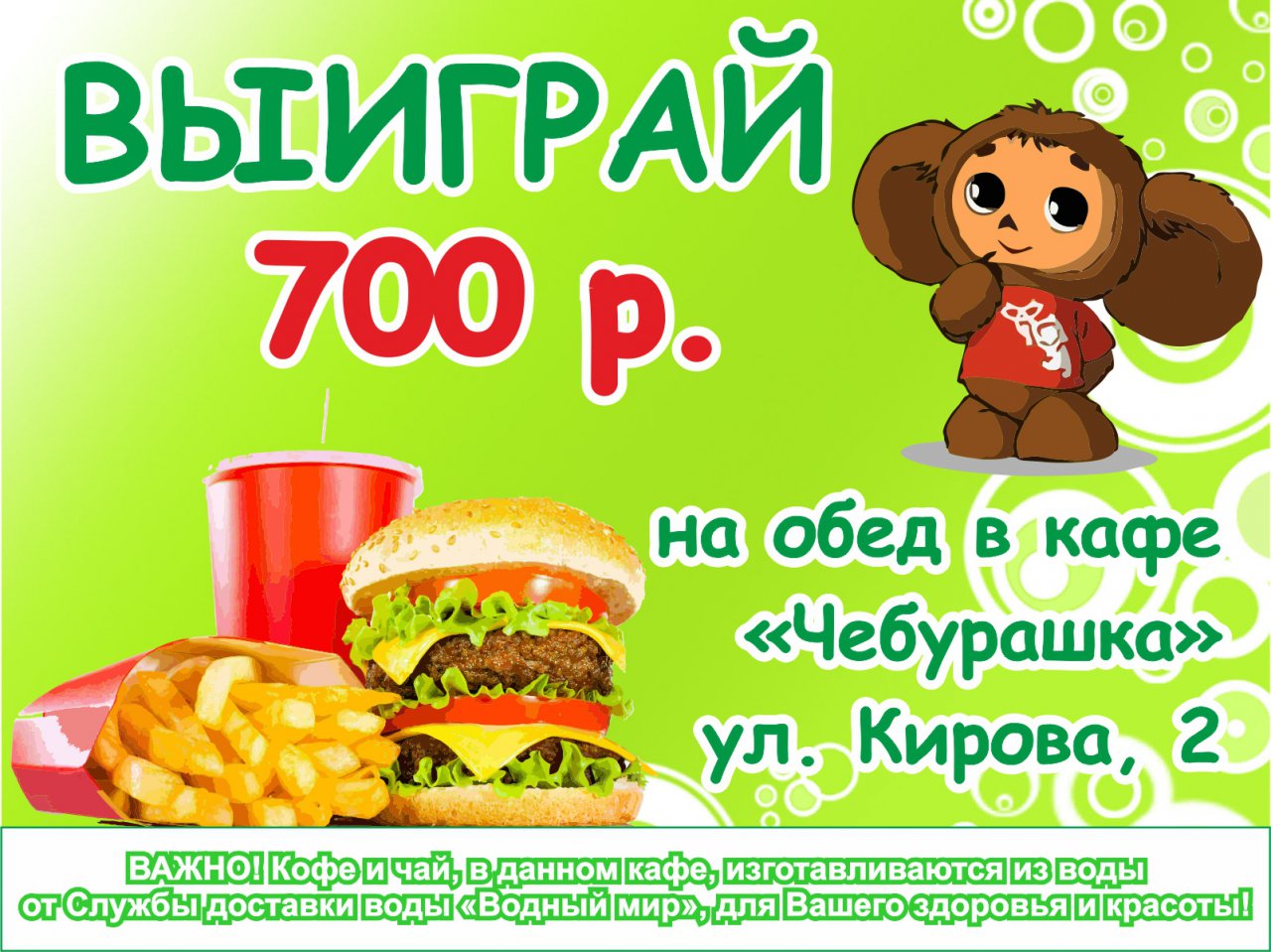 Участвуй в новой акции от Службы Доставки Воды и кафе «Чебурашка» и выиграй 700 рублей на обед в нем: