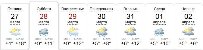 В воскресенье, 29 марта, также ожидают небольшой дождь. Температура воздуха ночью 5-7° тепла, днем 15-17° тепла.