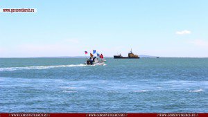На почтительном расстоянии спортсмена сопровождал катер. На катере, как и на берегу, акцию сопровождали символикой в виде георгиевских лент, флагов Российской Федерации, копии знамени Победы.