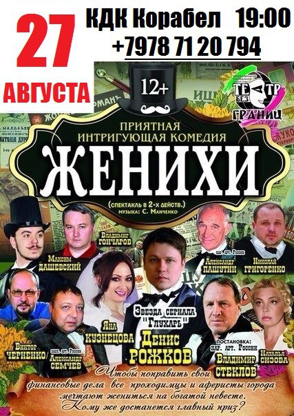 «Женихи» (спектакль в двух действиях), Музыка С. Манченко. В главной роли звезда сериала "Глухарь" Денис Рожков.