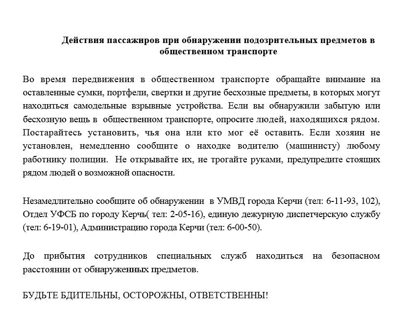 Также керчанам сообщают, что делать при обнаружении подозрительных предметов в общественном транспорте.