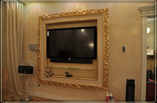 В багетную раму можно оформить не только телевизор, но и телевизионную нишу или портал.