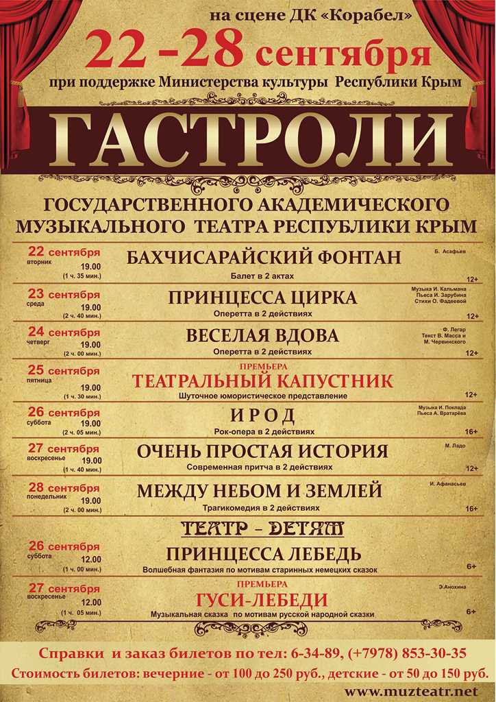 С 22 по 28 сентября, Государственный академический музыкальный театр республики Крым – на сцене ДК «Корабел»! при поддержке Министерства культуры Республики Крым! Билеты уже в продаже! Справки по телефону: 6-34-89, 2-04-78, 2-13-64.