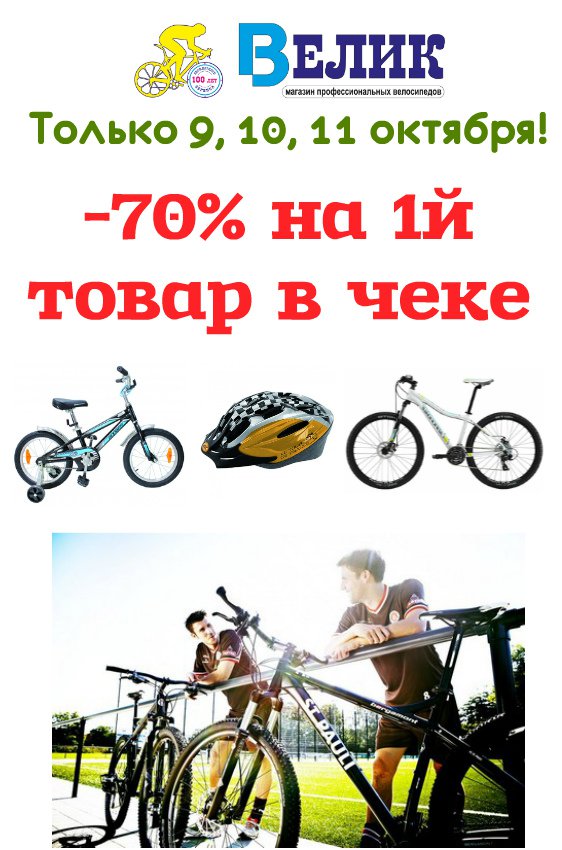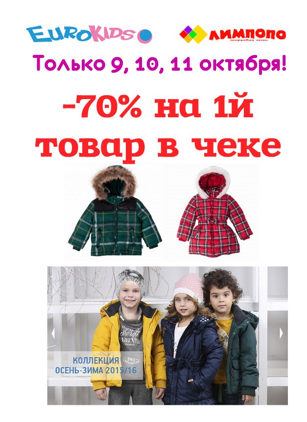 Торговая сеть ЛИМПОПО старается регулярно проводить скидочные дни, интересные акции, чтобы покупки были не только полезными, но и выгодными. Уже в эту пятницу во всех магазинах ЛИМПОПО, а также магазинах-партнерах Велик и EuroKids стартует акция «ТОЛЬКО 9-11окт. СКИДКА 70% НА 1й ТОВАР В ЧЕКЕ*». Это значит, что в течении трех дней можно приобрести с большой скидкой не только коляски, игрушки, велотовары, но и одежду! Подробности акции можно узнать у продавцов или на сайте limpopo.com.ru