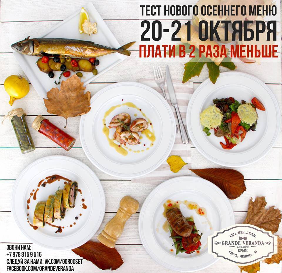 Ну что, готовы??? 20 и 21 октября мы запускаем тестовые дегустации нового осеннего меню на Твоей Веранде. Мы подумали, почему бы и нет, и решили в эти два дня, что Вы должны платить в два раза меньше за любое блюдо. Проще говоря, по себестоимости. Мест не так много, поэтому…Не забудь зарезервировать столик для себя и своих друзей по тел: +7 978 815 95 16. Звонки принимаем с 10:00 или просто загляни в ресторан