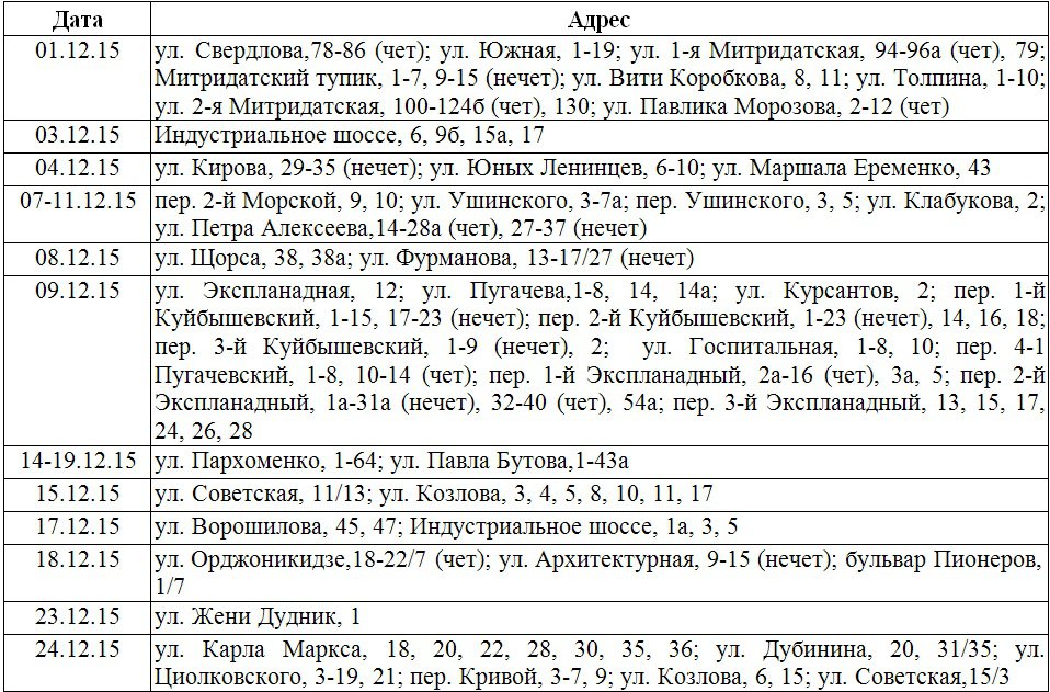 ГУП РК «Крымэнерго» сообщает о том, что в связи с плановым ремонтом электрооборудования в декабре с 8 до 17 часов будут происходить отключения линий электропередачи согласно нижеприведенному графику, - передает Керчь.ФМ.