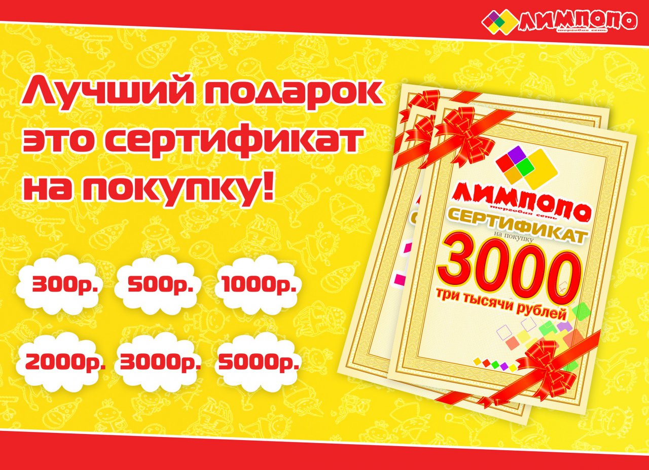 На тот случай, когда сложно определиться с подарком, ЛИМПОПО предлагает подарочные сертификаты разных номиналов. Их можно приобрести прямо на кассе магазина. ЛИМПОПО в г.Керчь находится по адресу ул. Советская, 26. Также действует дисконтная программа, благодаря которой можно получить скидки в розничных магазинах от 3% до 15%!
