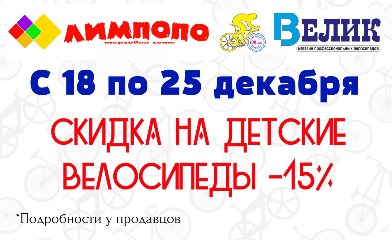 Один из традиционных и самых желанных подарков на Новый год - велосипед! Подарите ребенку море радости и веселья, при этом приучая его к спорту с малых лет. Скидки 15% действуют только в розничных магазинах ВЕЛИК и ЛИМПОПО с 18 по 25 декабря*