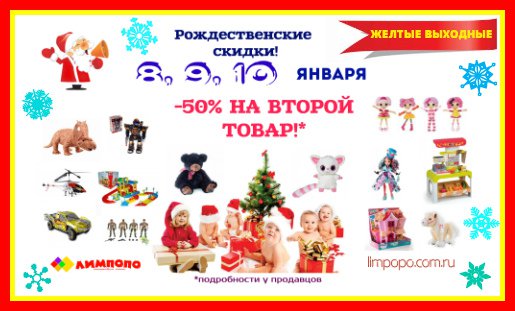 Покупать детские товары со скидкой в Керчи стало традицией, а эту традицию ввела сеть детских супермаркетов ЛИМПОПО. Рождественские праздники не обходятся без подарков, а выбрать их всем маленьким керчанам можно в магазине ЛИМПОПО, который находится по улице Советская, 26.