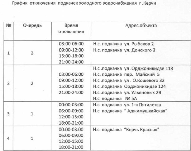 Керченский водоканал сообщает, что в связи с временным ограничением электроэнергии в городе вводится график отключения повышающих насосных станций, возможны перебои в водоснабжении верхних этажей многоквартирных домов, - передает Керчь.ФМ.