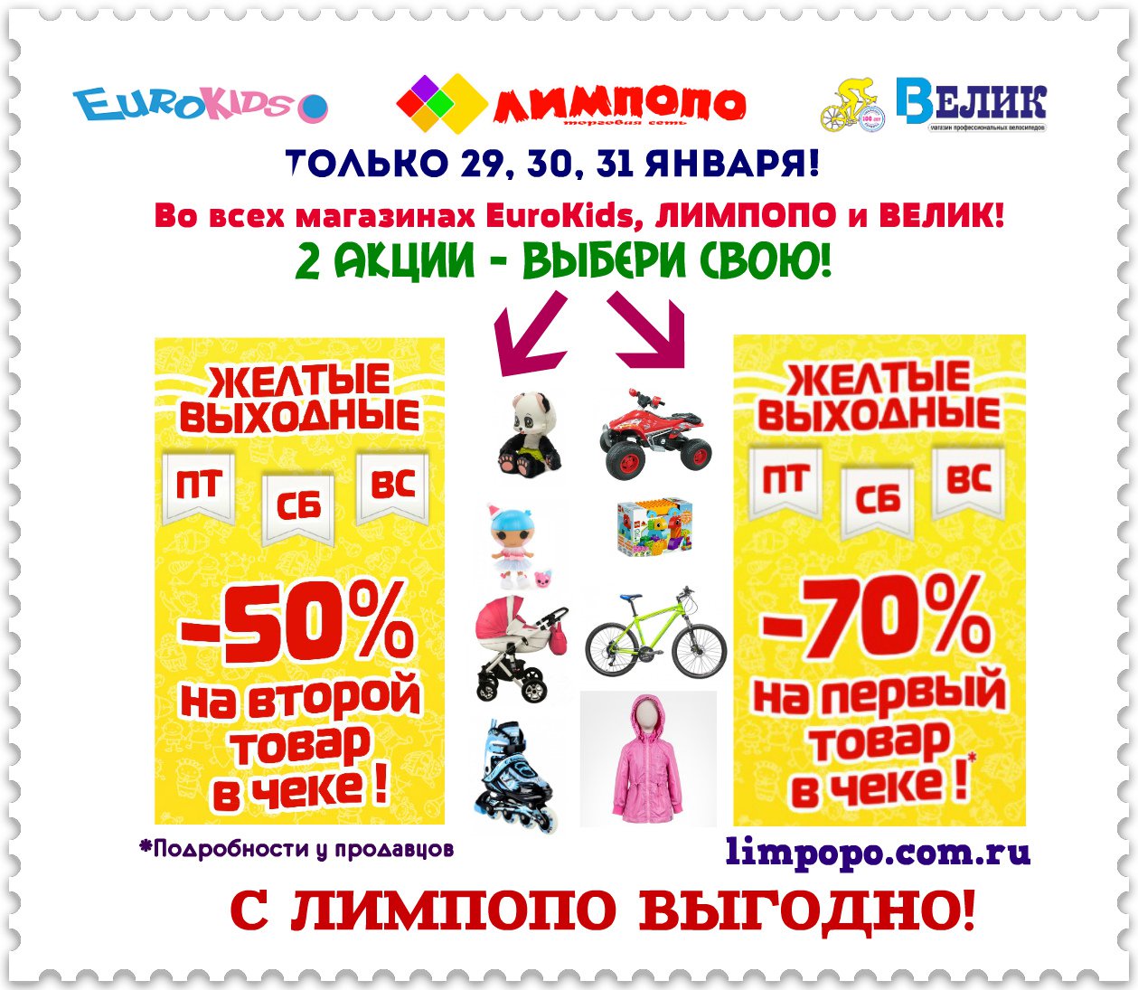 Во всех магазинах EuroKids, ЛИМПОПО и ВЕЛИК! 2 АКЦИИ - ВЫБЕРИ СВОЮ! -70% на 1-й товар в чеке, -50% на 2-й!