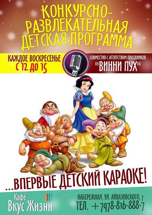 Каждое воскресенье с 12:00 до 15:00, пока родители наслаждаются заслуженным отдыхом, наши маленькие гости могут вдоволь наиграться в увлекательные игры с веселыми аниматорами, а также принять участие в командных конкурсах, порисовать, посмотреть мультики, а самое главное - спеть в ДЕТСКОМ КАРАОКЕ!