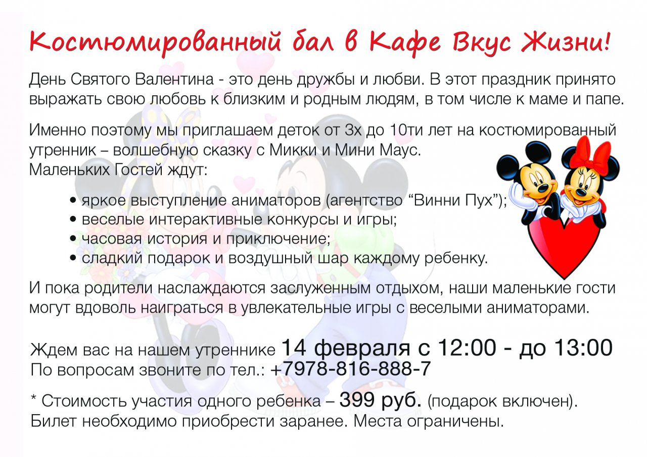 14 ФЕВРАЛЯ - ВОСКРЕСЕНЬЕ: Детский костюмированный утренник "МИККИ И МИНИ МАУС"!