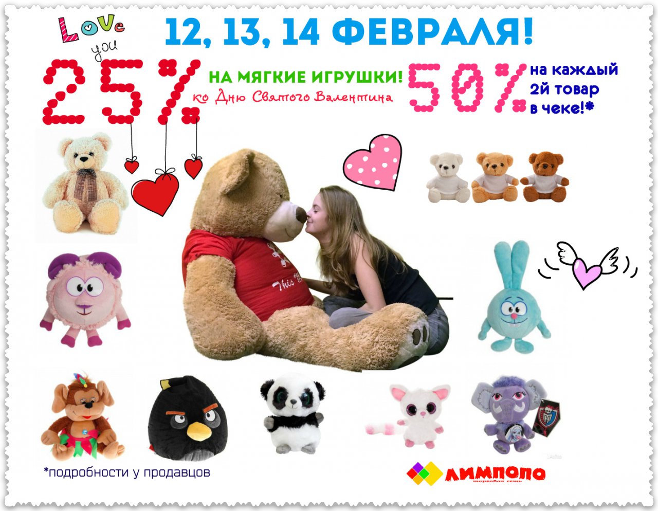Если ваш знакомые готовятся к выписке и рождению малыша, тогда мягкая игрушка будет отличным подарком как для мальчика, так и для девочки. В сети магазинов ЛИМПОПО 12, 13, 14 февраля действует скидка 25% на все мягкие игрушки! Также -50% на каждый второй товар в чеке с наименьшей стоимостью. Поэтому в детском магазине можно купить со скидкой не только товары для детей, но и для взрослых.