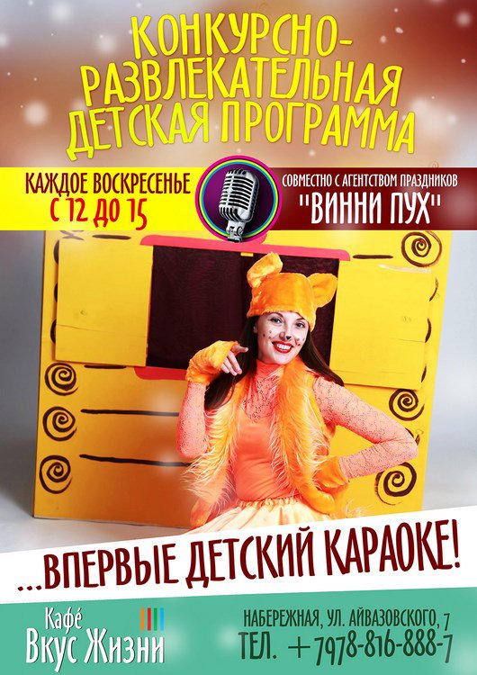 Каждое воскресенье с 12:00 до 15:00, пока родители наслаждаются заслуженным отдыхом, наши маленькие гости могут вдоволь наиграться в увлекательные игры с веселыми аниматорами, а также принять участие в командных конкурсах, порисовать, посмотреть мультики, а самое главное - спеть в ДЕТСКОМ КАРАОКЕ!
