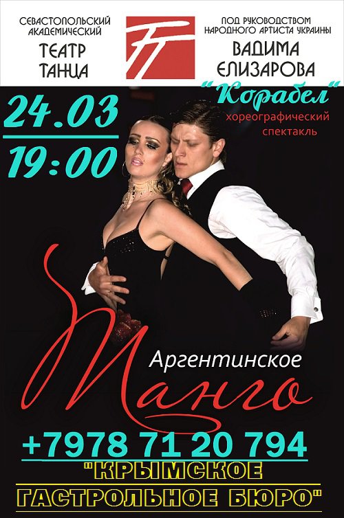 24 марта поклонников бальных танцев ожидает знакомство с танцевальным шоу «Аргентинское танго». Каждый вечер после тяжелого рабочего дня одинокие мужчины приходят потанцевать танго, чтобы снять усталость, и ощутить аромат женщины. Каждый мужчина, танцуя танго, ощущает себя мужчиной, а женщина - женщиной. Мы приглашаем Вас увидеть это прекрасное и таинственное шоу, прочувствовав все эмоции, переживаемые в нашем «Аргентинском танго». Начало представления в 19 часов.