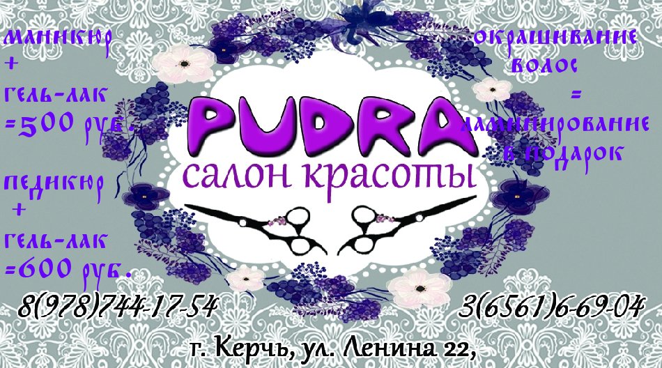 Салон красоты «Пудра». Именно там и только там есть всё для комплексного, а это значит самого эффективного ухода за самыми хрупкими и в то же время самыми заметными гранями вашей привлекательности.