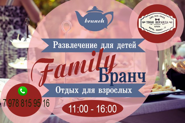 Твоя Веранда приглашает на Бранч выходного дня! Создавайте своё идеальное меню по особенно привлекательной цене. Взрослое и детское меню, приятная музыка, аниматор для детей.