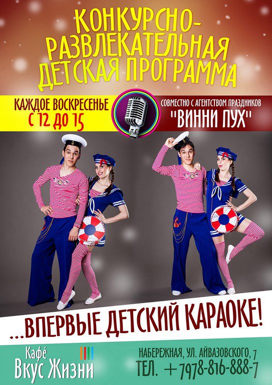 Именно для маленьких озорников мы проведем тематичную детскую программу с веселыми аниматорами агентства "Винни Пух"! Веселые конкурсы, игры, викторины, разукрашки, мультики, а самое главное - ДЕТСКИЙ КАРАОКЕ!