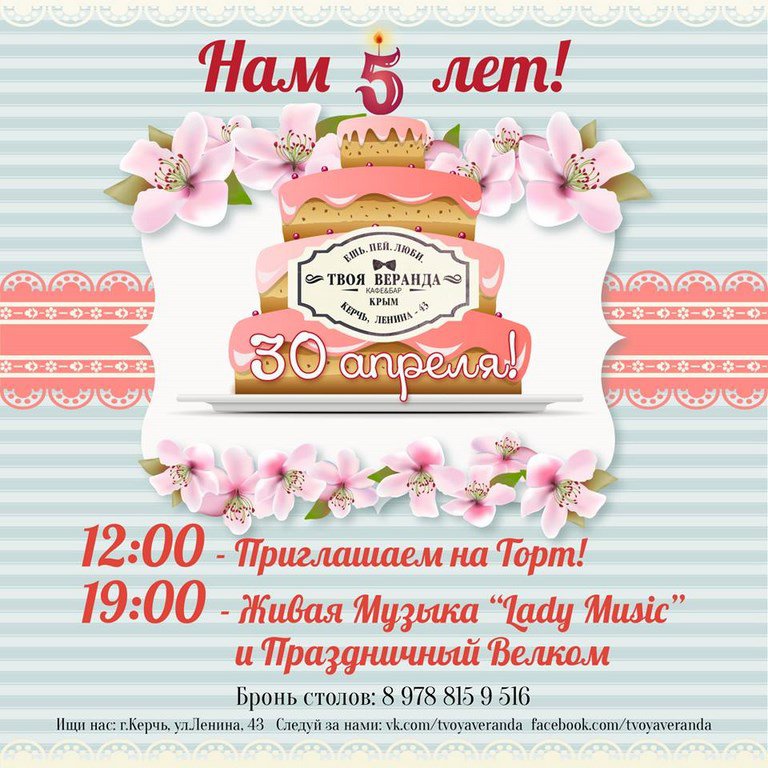 30.04 в 12:00 приглашаем Вас на нашу ЛЕТНЮЮ ВЕРАНДУ, где будем угощать праздничным тортом, какого вы еще не пробовали!