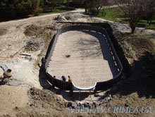 Чаша бассейна, по данной технологии, формируется с применением кассетной полипропиленовой опалубки, которая представляет собой отдельные сегменты шириной по 25см. с гладкой лицевой поверхностью и нишей для заливки бетона. Эти отдельные элементы опалубки легко соединяются между собой в соответствии с геометрией бассейна, причем прямолинейность или кривизна борта не влияют на стоимость опалубки. Далее она устанавливается непосредственно в котловане, армируется вместе с дном. С внешней стороны опалубки устанавливаются специальные регулируемые стойки, которые повышают прочность конструкции и помогают быстро выровнять борт бассейна в вертикальной плоскости. Затем опалубка и дно заливаются бетоном в один этап, после чего происходит обратная обсыпка чаши.