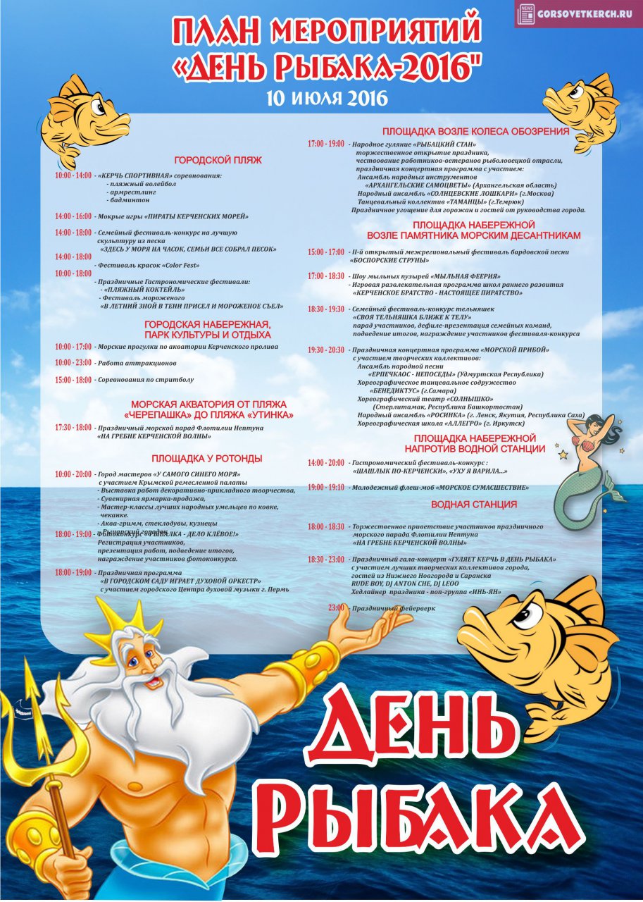 В 17.00 в районе колеса обозрения пройдет традиционное народное гуляние «Рыбацкий стан», а в 17.30 от пляжа «Черепашка» стартует морской парад Флотилии Нептуна «На гребне керченской волны».