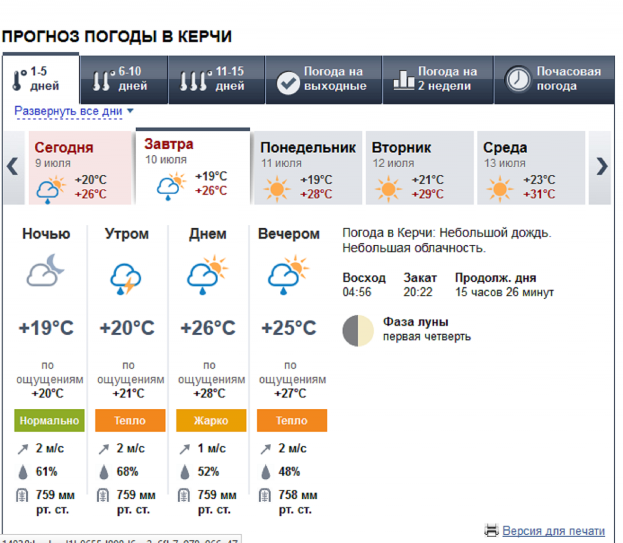 «По данным Крымского управления по гидрометеорологии и мониторингу окружающей среды ночью и днем 10-го июля в Крыму ожидаются местами сильные ливни, грозы, град, шквал 18-23 м/с», - говорится на сайте ведомства.