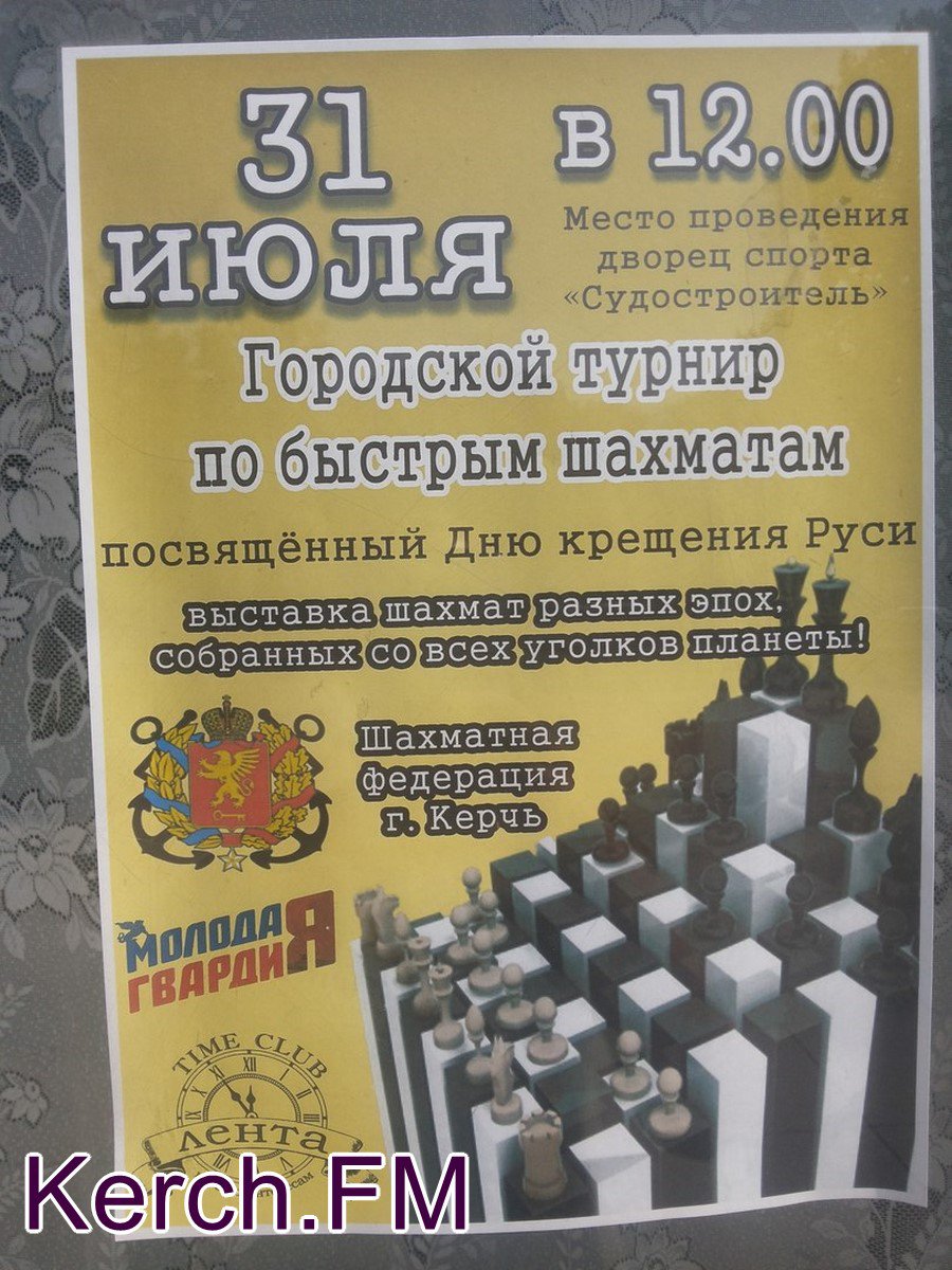 В Керчи, 31 июля в 12.00, во дворце спорта «Судостроитель», пройдет городской турнир по быстрым шахматам. Мероприятие посвящено Дню крещения Руси, - передает Керчь.ФМ.