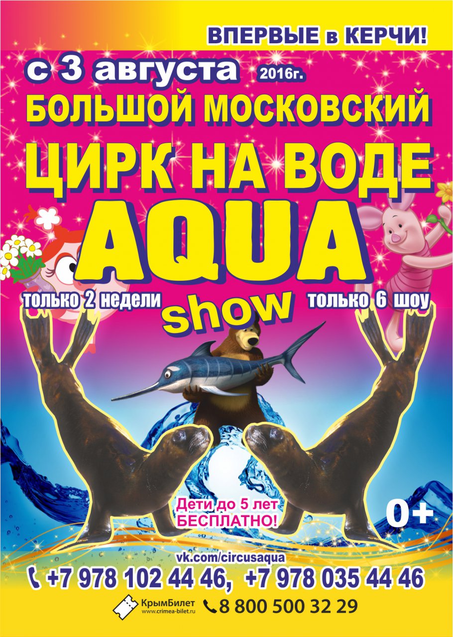 Новая программа «AQUA-show» окунет Вас в фантастический незабываемый мир мифических существ- парящих в воздухе, манящих в небесные воды бассейна. Накроет волнами сильнейших чувств восхищения, удивления, сопереживания и вдохновения. Окружит Вас в магический волшебный сплав искрометного мастерства циркового искусства, неповторимой фееричной музыки, потрясающей Ваши взоры хореографии в воде, многообразие и ликование фонтанов. Сказочное насыщенное световое оформление надолго заворожит Вас незабываемыми воспоминаниями. Погружаясь вместе с нами в чистые воды «AQUA-Show», вы окунетесь с головой в ваши детские мечты, где они рождаются на ваших глазах, создавая историю магической сказки. Для этого спектакля специально подобрана уникальная труппа цирковых артистов разных жанров.