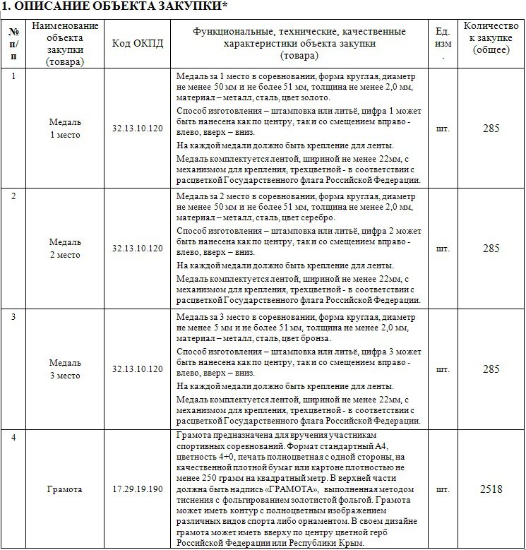 Согласно технической части планируется закупка 285 медалей и 2518 грамот.