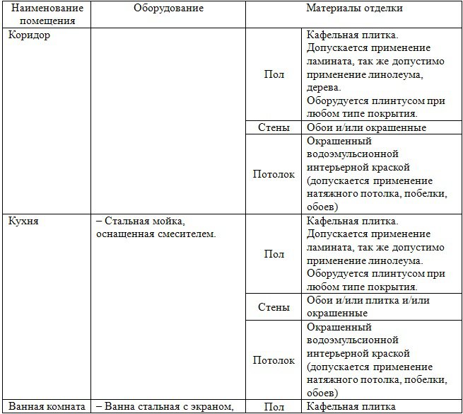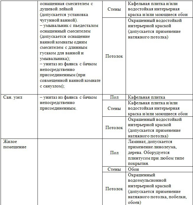 Также она должна быть отремонтирована: исправное состояние окон, дверей, отсутствие повреждений полов, восстановленные защитно-отделочные покрытия стен и потолков, дощатые полы должны быть покрашены, санитарно-техническое оборудование должно находиться в исправном рабочем состоянии (ванная и раковина не должны иметь нарушений эмалевого покрытия, сколов и трещин; унитаз и мойка - сколов и трещин).