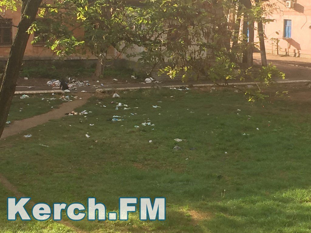 В редакцию Керчь.ФМ постоянны читатель прислал фотографию с изображением своего вида из окна. Судя по фотографии, весь двор по улице Льва Толстого, 12 усыпан мусором, который тут же растаскивают собаки. Жители просят администрацию города принять меры.
