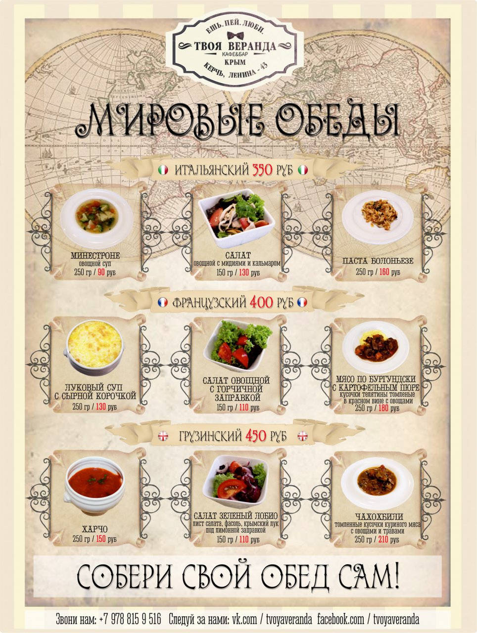 Бонжур! Бонжорно! Гамарджоба! Твоя Веранда приглашает всех ценителей настоящей европейской кухни отобедать. Для тех, кто устал от борщей и картошки, кто во снах мечтает о Париже, Италии, Грузии, Твоя Веранда предлагает на выбор комплекс обедов итальянской, французской и грузинской кухни. Не нужно себя ограничивать рамками одной кухни. Ты можешь собрать свой обед Сам! Стоит только прийти к нам)