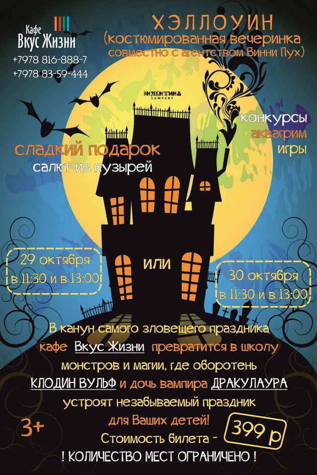 Только раз в году кафе "Вкус Жизни" наполняется загадками и тайнами, волшебством и магией. В этот раз оно превратится в школу монстров, ведьм и других героев сказок и мультфильмов. Оборотень Клодин Вульф и ее подруга, дочь коварного вампира, Дракулаура будут обучать своих учеников, играть с ними в захватывающие игры, испытывать в увлекательных конкурсах и закружат в салюте из мыльных пузырей. Маленькие гости будут посвящены в истинные магистры Магии и Чародейства! О многих развлечениях подружки предпочли не рассказывать, пусть это будет сюрпризом, однако о подарках они нам шепнули. Каждого маленького гостя будет ждать "сладкий мешочек", ведь какой Хэллоуин без сладостей? По желанию свой образ бесплатно можно будет дополнить аквагримом до начала праздника согласно выбранному Вами времени.
