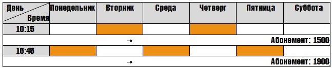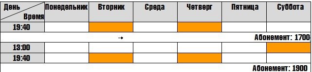 8 тренировок (1500 р), 12 тренировок (1900 р), 16 тренировок (2300 р)
