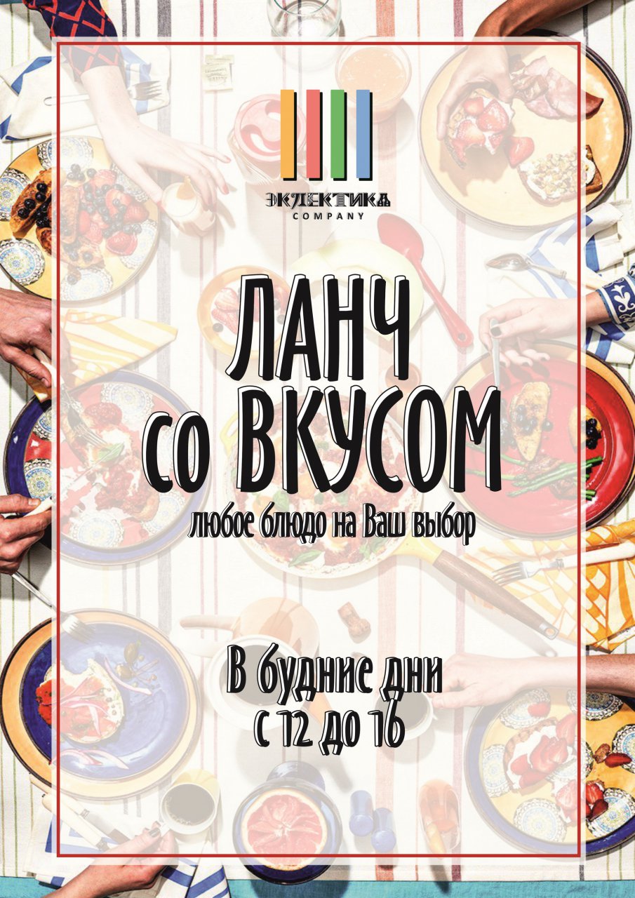 По будням, с 12:00 до 16:00, Вы можете составить свой уникальный обед из предложенных блюд в ланч - меню. Без каких-либо ограничений и фиксированных комплексов!