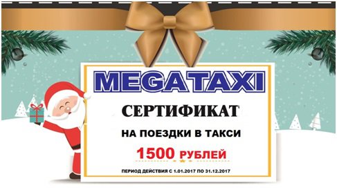 Совершая поездки на «Мега такси» с 1 декабря по 29 декабря 2016 года, Вы имеете возможность выиграть сертификат номиналом в1500 рублей, 1000 и 500 рублей на поездки в такси.