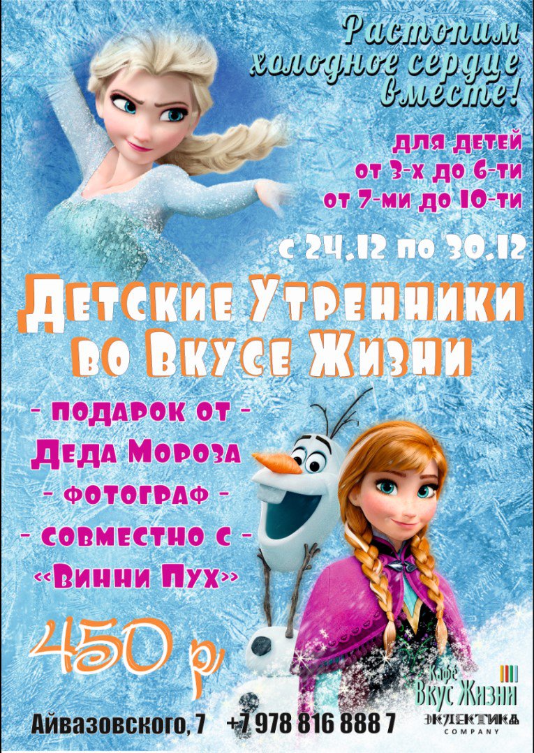 С 24.12 по 30.12, в преддверии Нового Года совместно с агентством по проведению праздников "Винни Пух" в кафе "Вкус Жизни" пройдет целая сессия праздничных утренников для малышей (от 3-х до 6-ти) и для детей постарше (от 7-ми до 10-ти) под лозунгом: "Растопим холодное сердце вместе!".