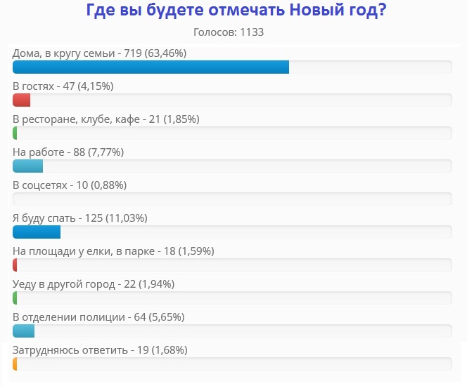 Соцсетям не повезло, меньше 1% читателей собираются именно там встретить 2017 год. Надеемся, что это так). И почти 2% - в раздумиях. Наверное, им поступило много предложений, и эти читатели еще не определились, где им встретить праздник.