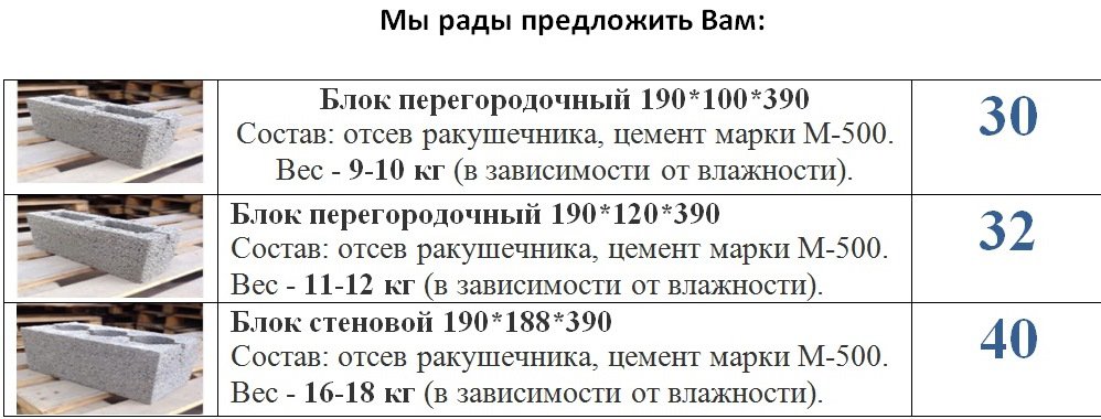 - более широкая линейка размеров (стеновой 190х190х390, перегородочные 190х120х390; 190х100х390)