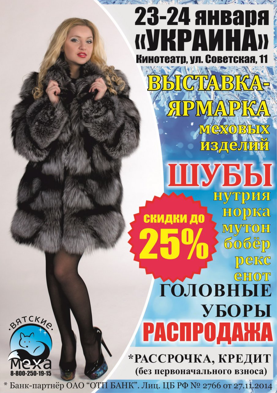 РАСПРОДАЖА меховых изделий с 23-го по 24-ое января в Кинотеатре «Украина», г.Керчь, ул. Советская, 11
