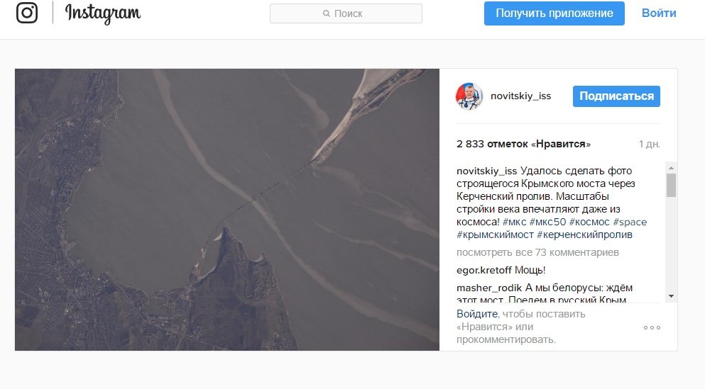 Космонавт Олег Новицкий сфотографировал с борта МКС строящийся мост через Керченский пролив и опубликовал снимок в «Инстаграм», - передает Керчь.ФМ.