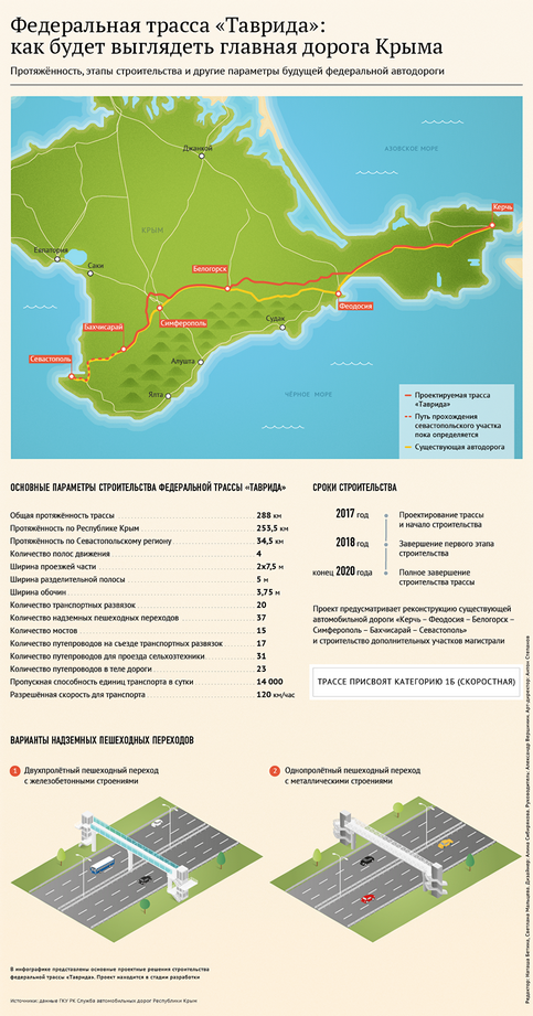 Новая четырехполосная автотрасса «Таврида» соединит Керчь с Симферополем и Севастополем. Первый этап строительства автотрассы планируется завершить к концу 2018 года, второй — к концу 2020 года.