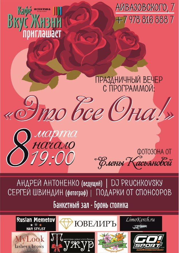 Праздничный вечер пройдет в банкетном зале кафе "Вкус Жизни", ул. Айвазовского, 7.