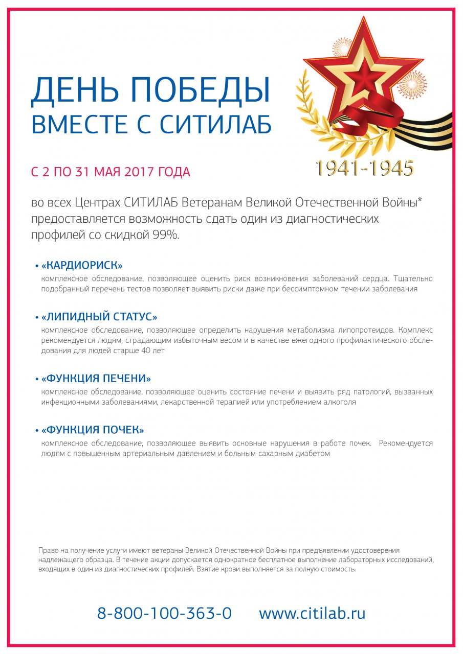 День Победы, вместе с «СИТИЛАБ», с 2 мая 2017 года по 31 мая 2017 года включительно во всех Центрах обследования пациентов действует скидка* 99%.