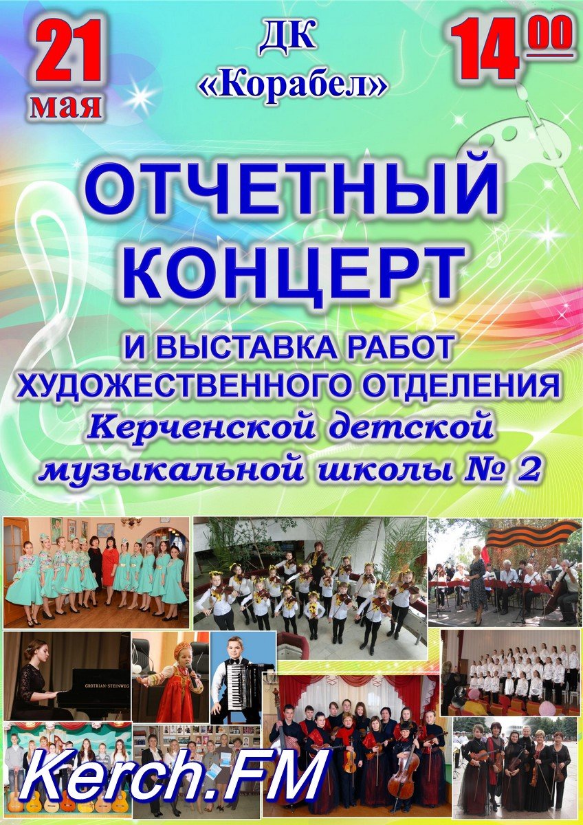 В Керчи 21 мая, в ДК «Корабел» пройдет отчетный концерт Керченской детской музыкальной школы № 2. Также пройдет выставка работ художественного отделения, - передает Керчь.ФМ