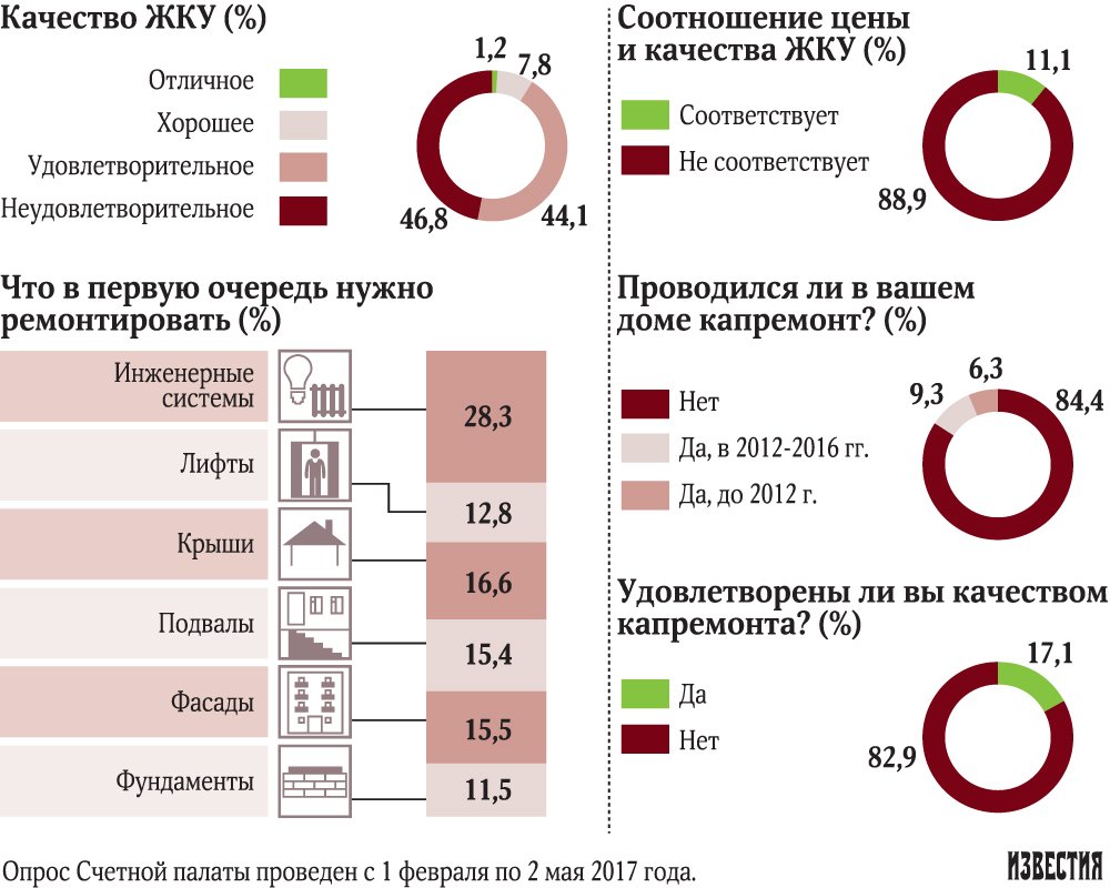 Эксперты считают, что у собственников есть все основания быть недовольными. Они не могут воспользоваться своими правами, самостоятельно выбрать управляющую компанию или заменить ее на другую. В пресс-службе Счетной палаты «Известиям» сообщили, что опрос населения о качестве жилищно-коммунальных услуг проводился с февраля по май этого года. Участие в нем приняли 3 200 граждан из более чем 60 субъектов РФ.