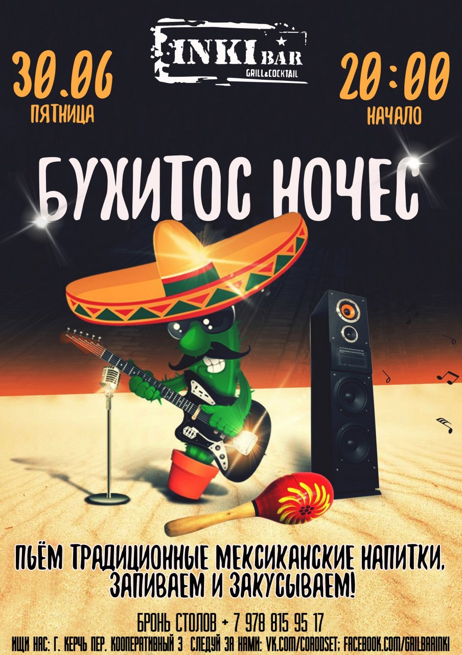 Друзья! Гриль-бар ИНКИ приглашает провести этот пятничный вечер в зажигательной и веселой атмосфере вместе с нами и Гордостью Мексики. Пьем традиционный мексиканский напиток, запиваем сангритой и закусываем начосами с сальсой. Приходи, мы не дадим тебе заскучать)))